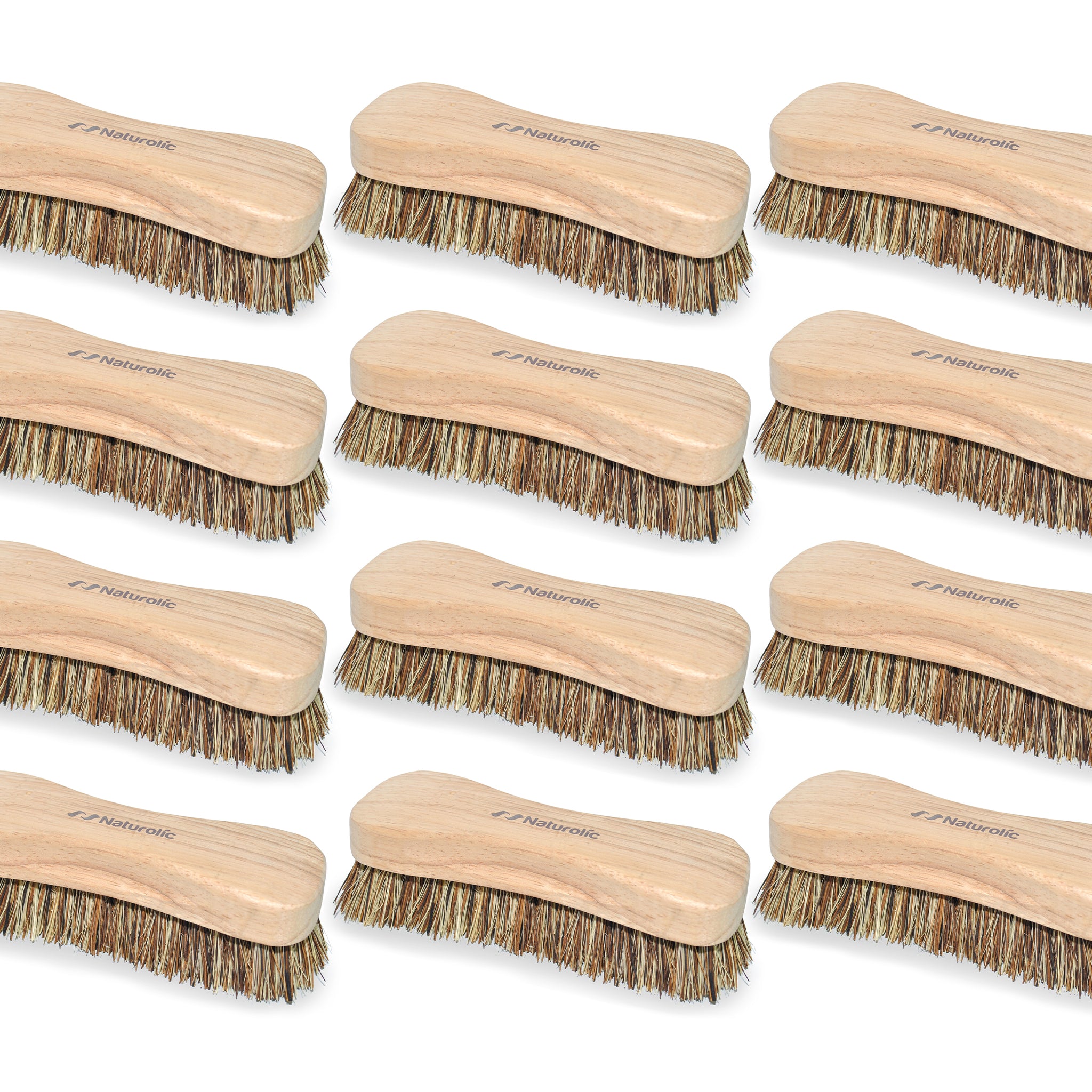 The Naturolic all-natural eco friendly scrub brush provides a cleaning solution for a variety of surfaces including tile, grout, carpet, iron, stone and many more. This scrubbing brush works perfectly as a vegetable brush, kitchen scrub brush, sink brush, deck scrub brush, and many other cleaning needs. The wooden handle scrub brushes are made out of rubber wood and the bristles are made out of stiff but flexible palmyra fibers or medium stiff tampico fibers. These natural bristles provide better water absorption than plastic bristles. The ergonomic peanut shaped handle with an especially designed groove to enhance the grip provides a comfortable cleaning experience. This product is 100% backyard compostable.